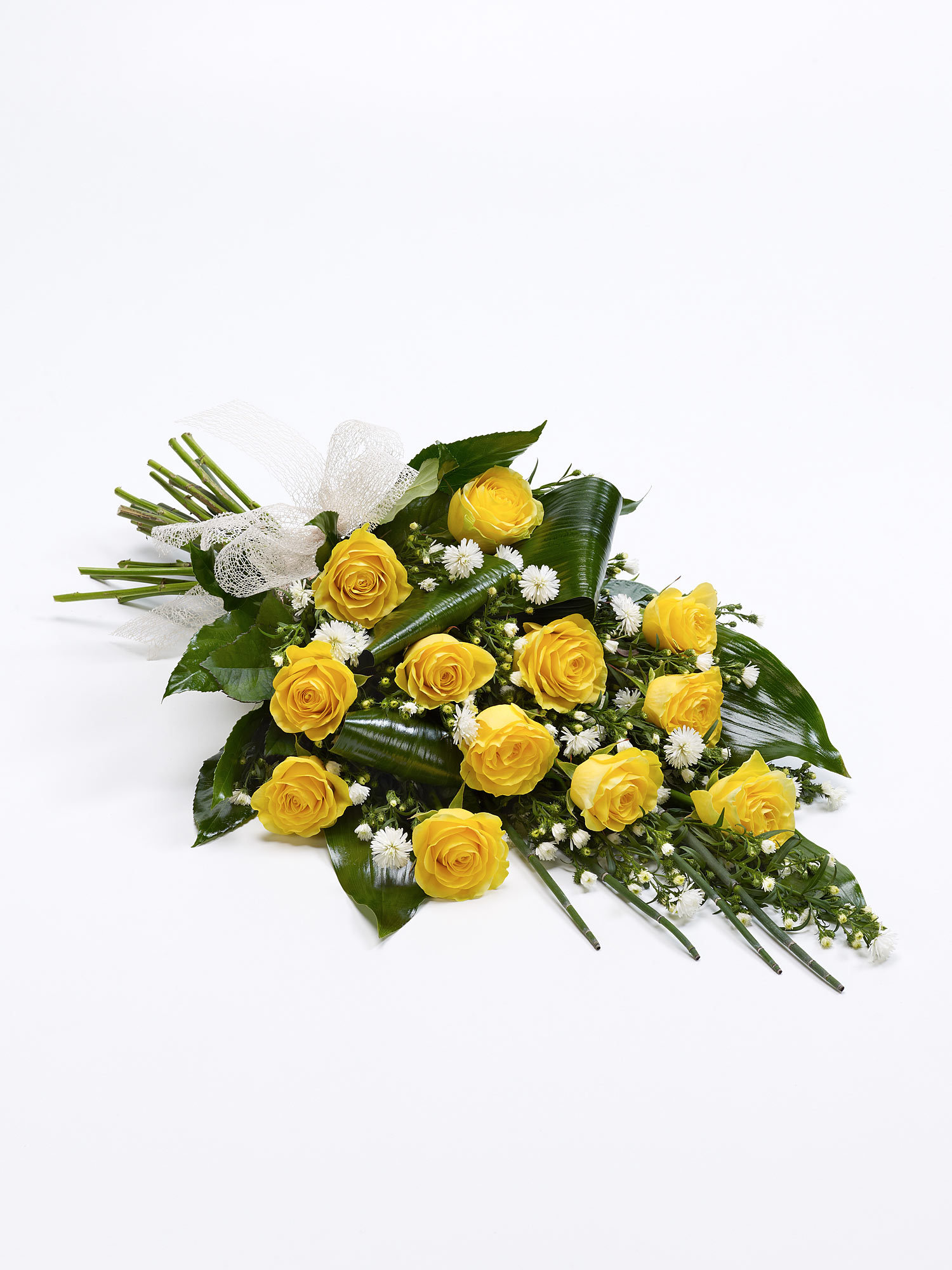 Elegant folded aspidistra and aralia leaves are nestled amongst large-headed red roses to create this stunning sheaf which is finished with delicate white September flower and foliage.