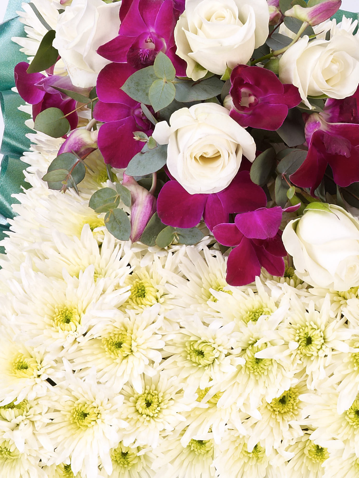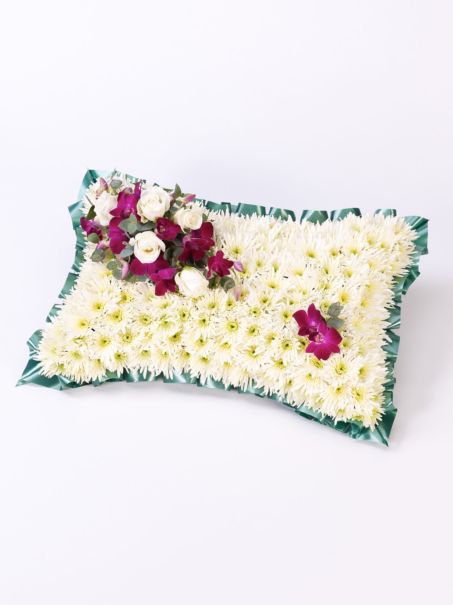 A classic pillow-shaped design created using a mass of white double spray chrysanthemums and finished with a spray of white large-headed roses and purple dendrobium orchids.