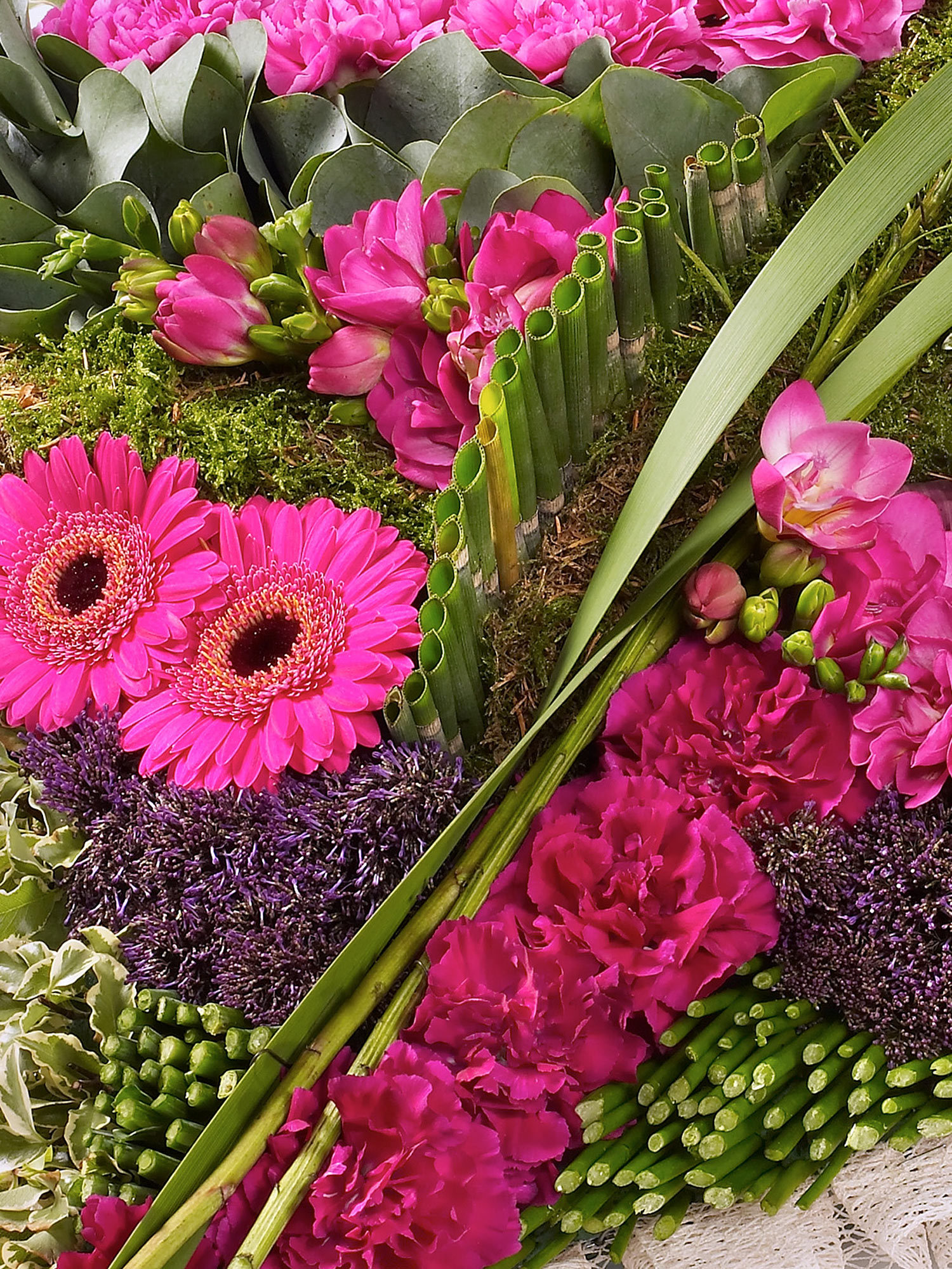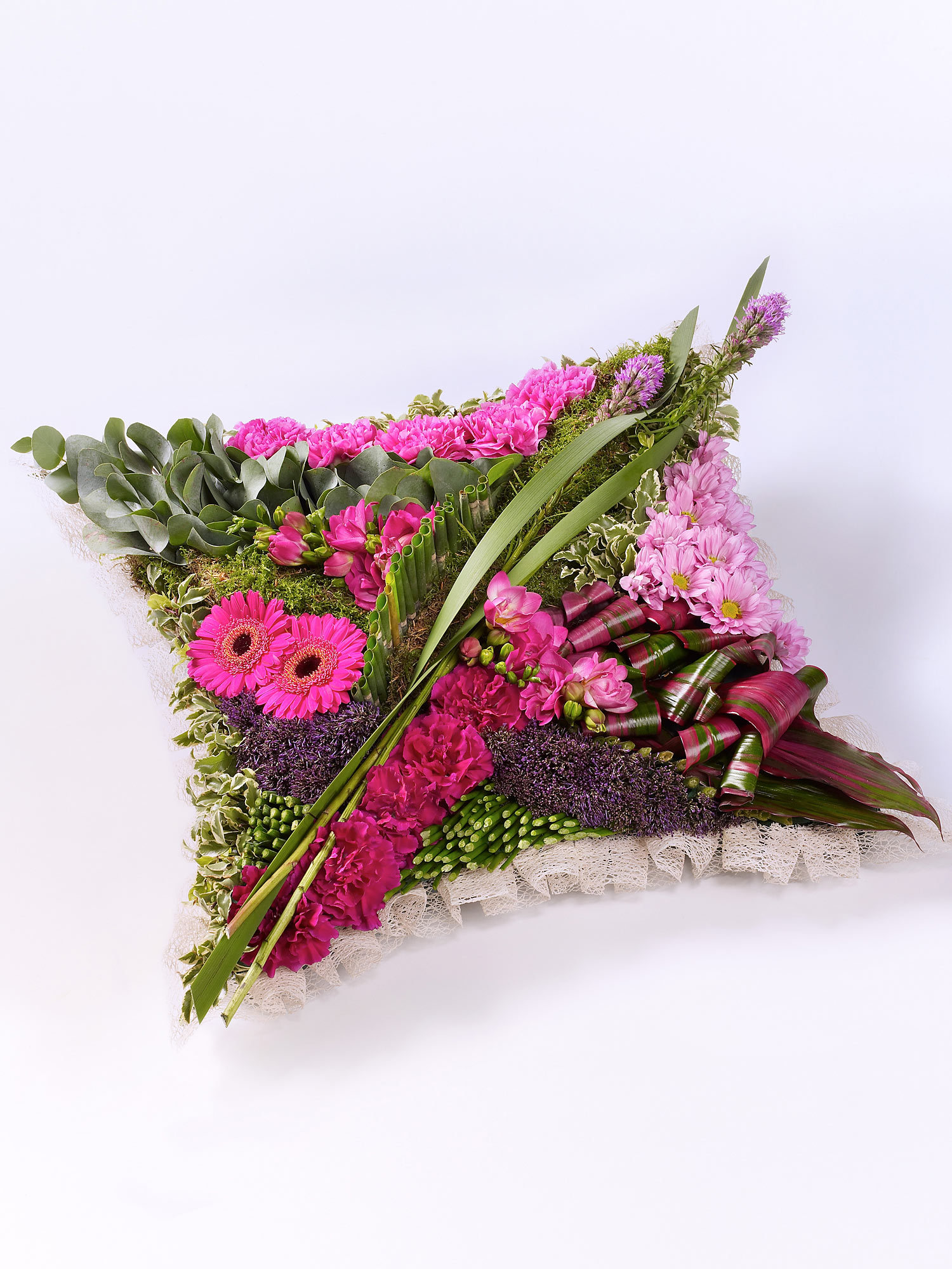 This striking contemporary cushion-shaped design features a selection of flowers in pinks and purples and includes liatris, carnations, germini, freesia and chrysanthemums.
