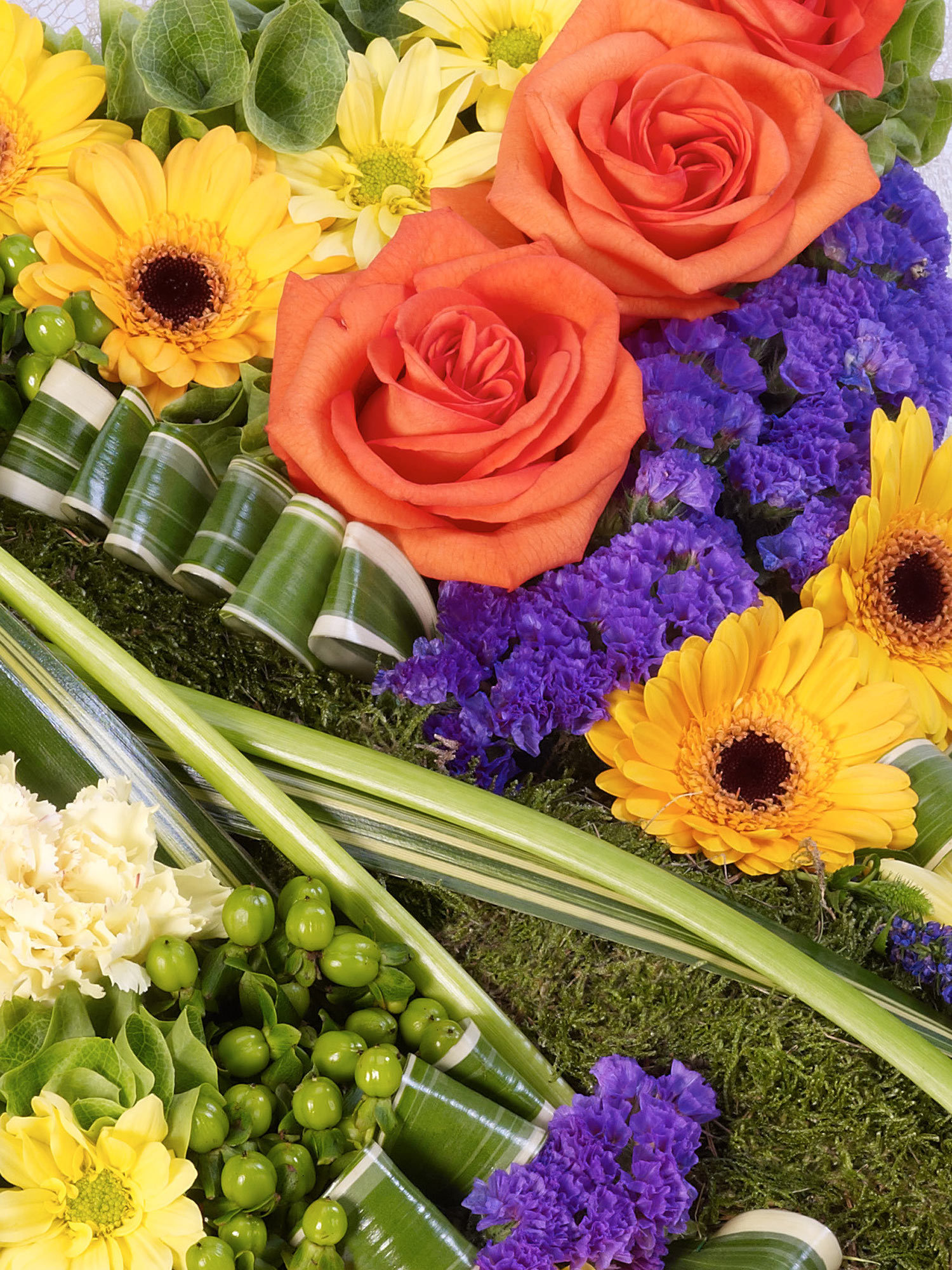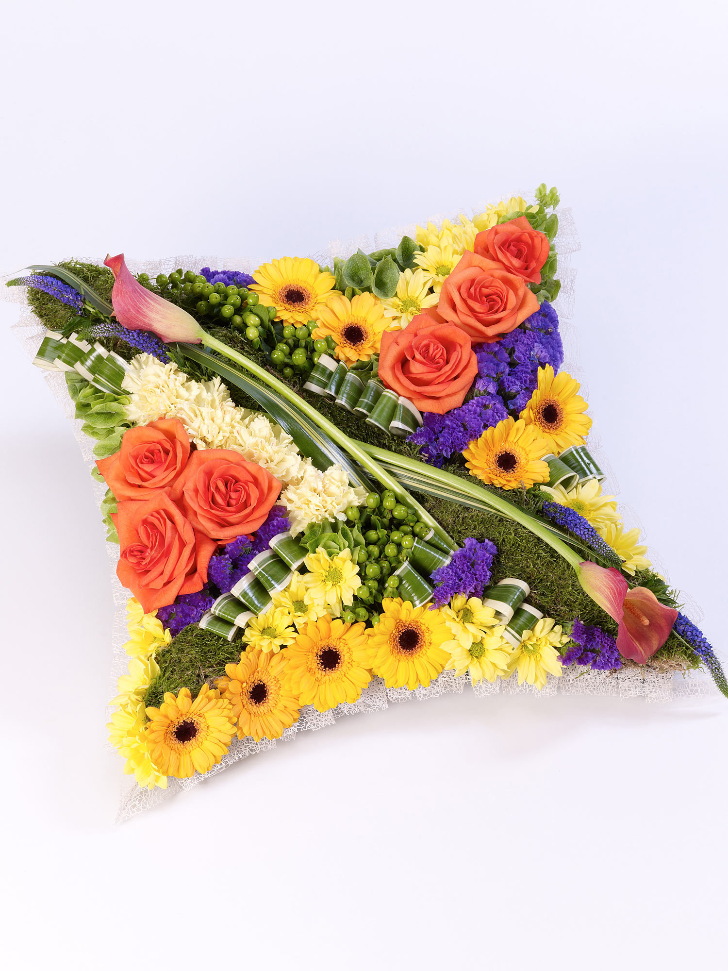 This striking contemporary cushion-shaped design features a selection of flowers in vibrant yellow, orange, purple and pink and includes roses, germini, carnations and statice. The design is completed with sweeping calla lilies and veronica. Approximate Product Dimensions: Length: 45cm Width: 45cm 37 Stems