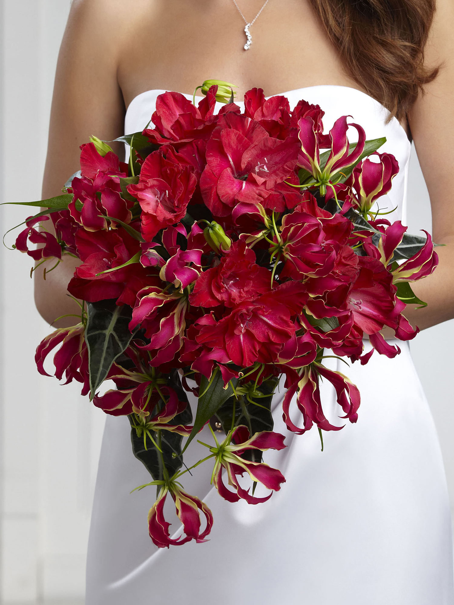 This striking bouquet is a truly romantic way to complete your bridal look. Red gloriosa lilies and red gladiolus is accented with dark green tropical leaves and tied together at the stems with a chocolate brown grosgrain ribbon to create a voluminous bouquet symbolising your eternal love and affection. Approx. 16″H x 14″W.
