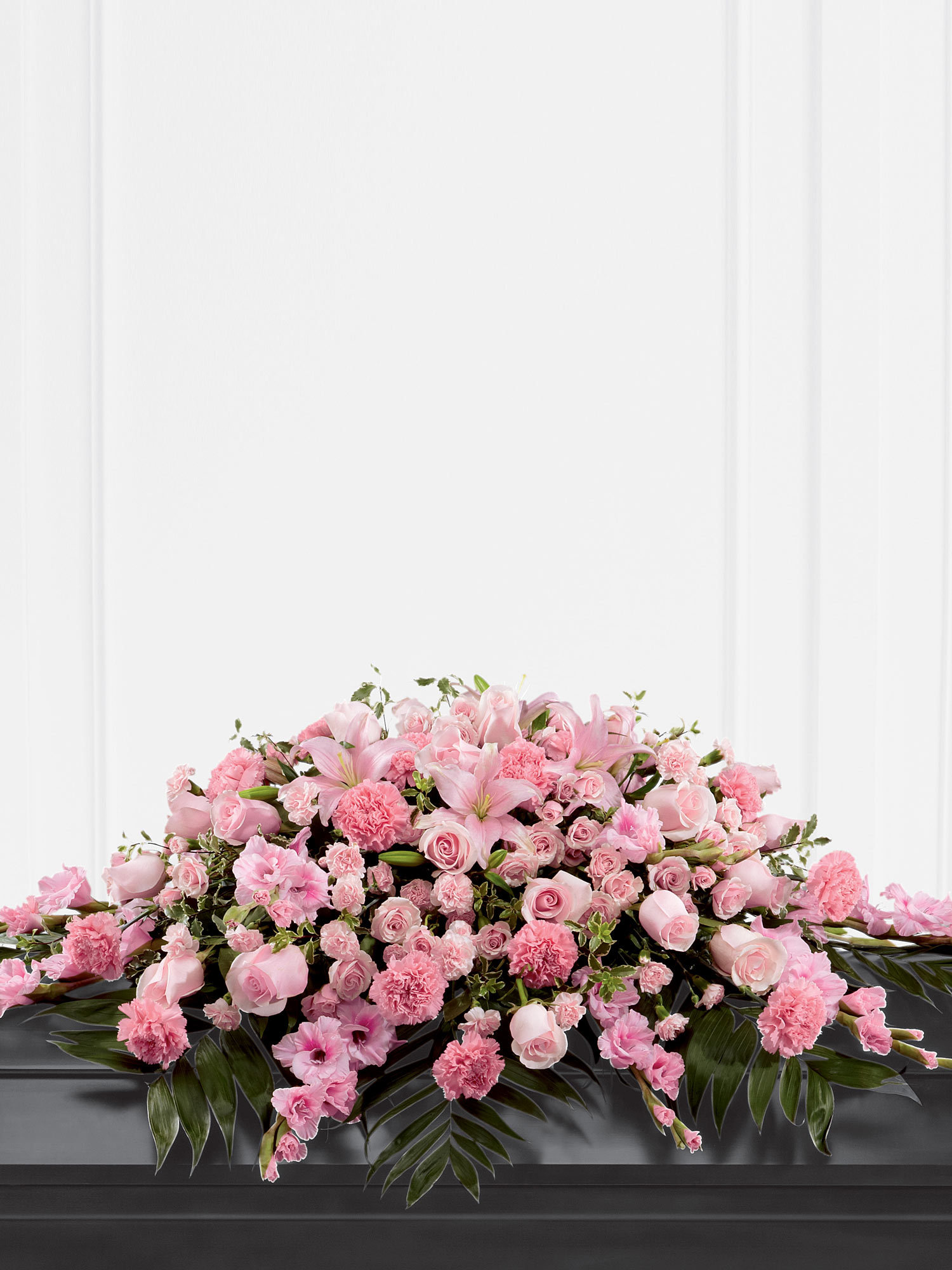 This beautiful casket spray features blushing pink roses, spray roses, carnations, gladioli, spray carnations and Asiatic lilies, all elegantly arranged amongst an assortment of lush greens to create a very elegant display.