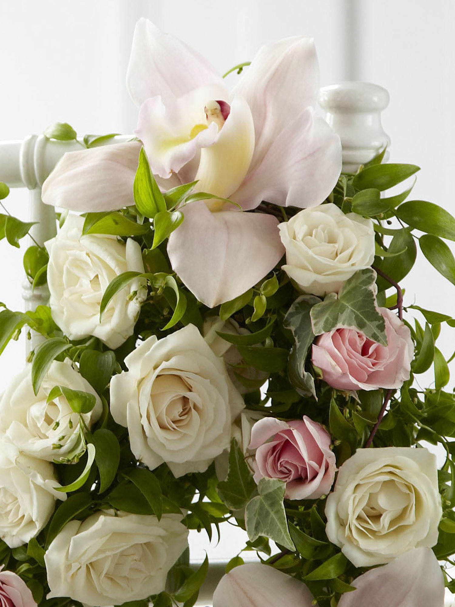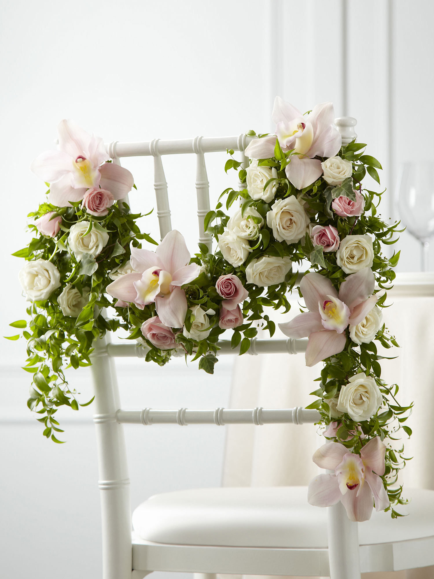 This orchid and rose chair decoration takes any reception décor to a new level of sophistication. Pink cymbidium orchids and white and pink spray roses are arranged beautifully with variegated ivy vines and smilax. The garland is designed to be draped on the back of a standard chair, adding that extra special touch to your wedding day. Approx. 48-inches in length.