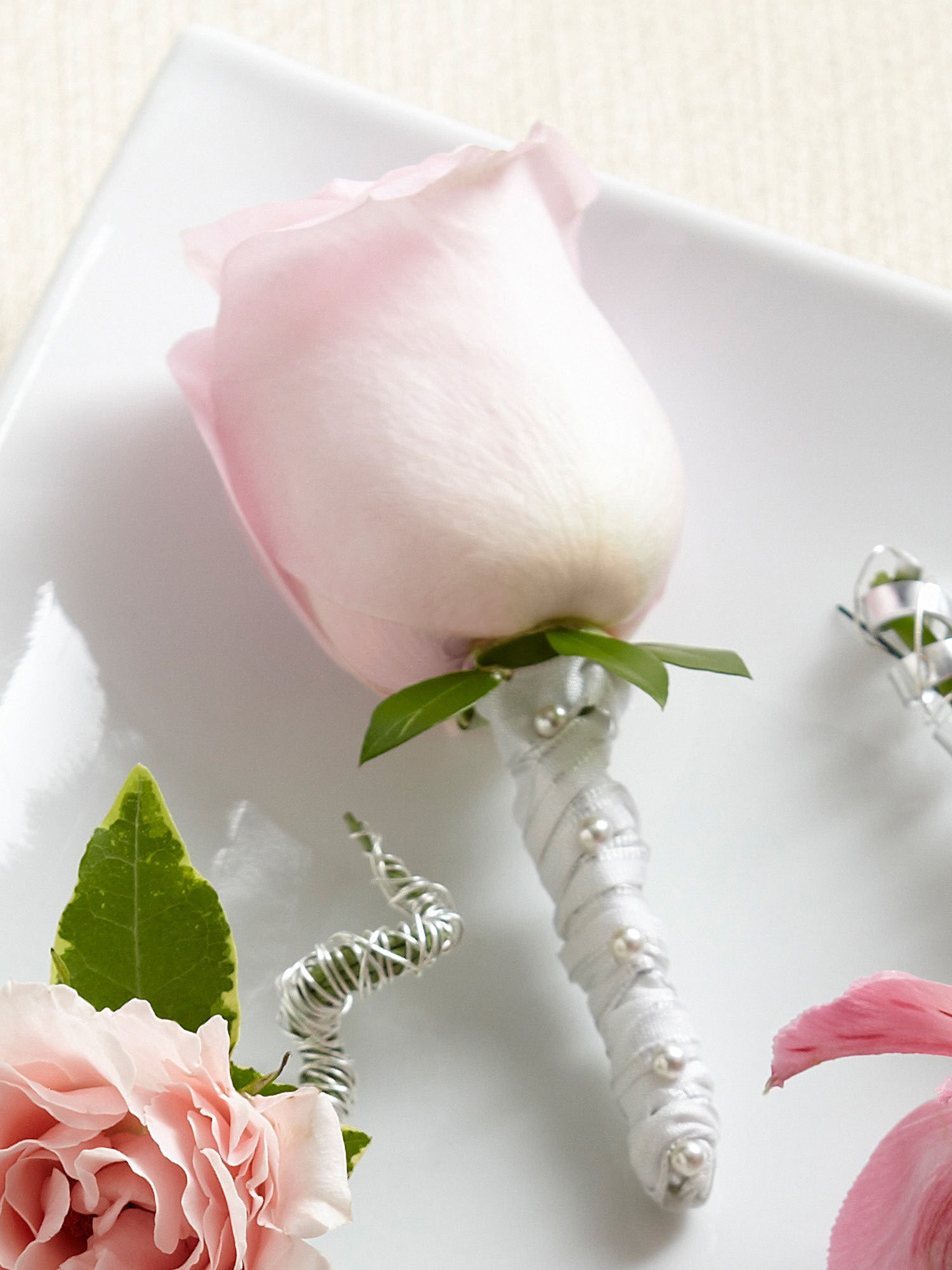 The Pink Rose Boutonniere creates the classic picture of wedding elegance. A single pink rose is chosen for its absolute perfection then accented with lush greens and a white taffeta ribbon to offer its beauty and sweet fragrance in honour of the wedding celebration. Approx. 4″H x 2″W.