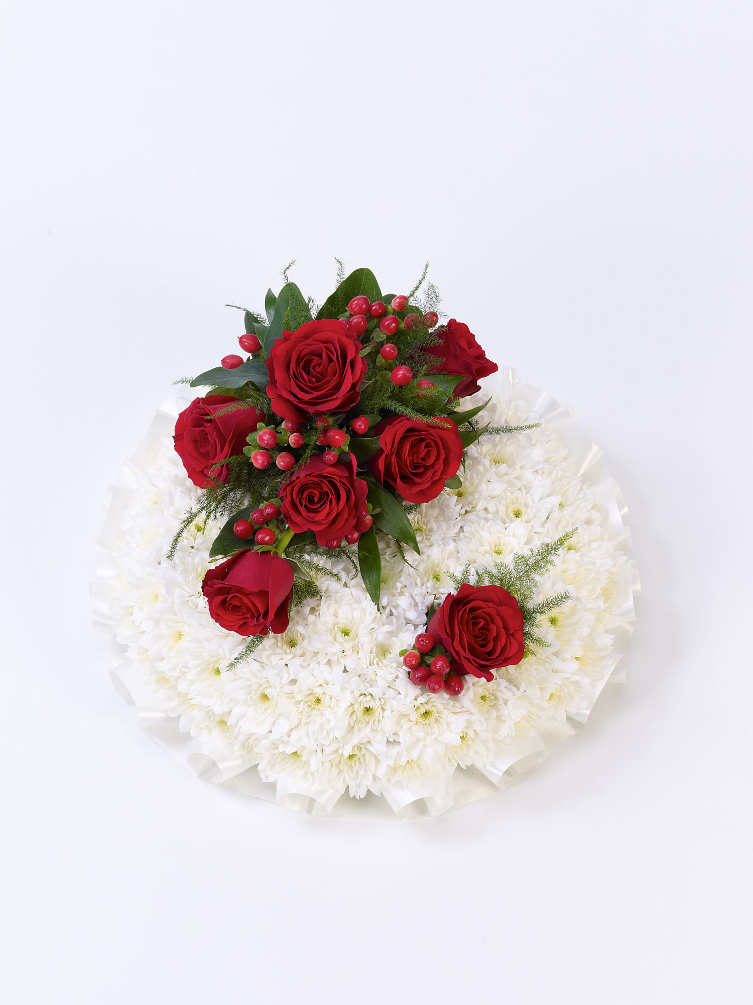 A classic posy design created using a mass of white double spray chrysanthemums and completed with a spray of roses, French ruscus and hypericum berries.
