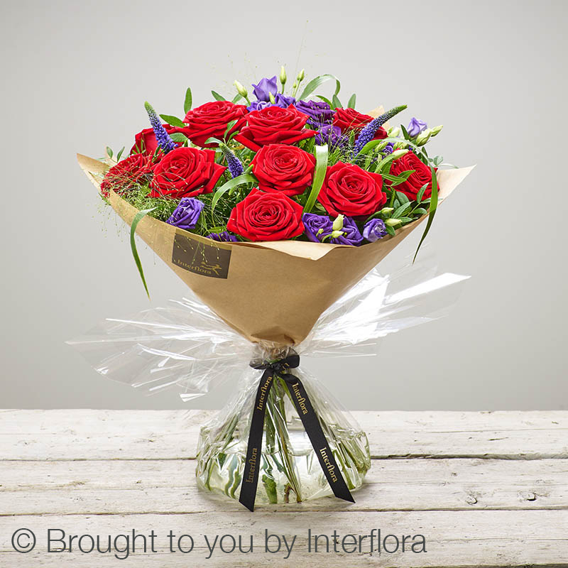 Featuring red large headed roses, purple lisianthus and purple veronica hand-tied with pistache and panicum grass, presented in Interflora Gift Packaging.