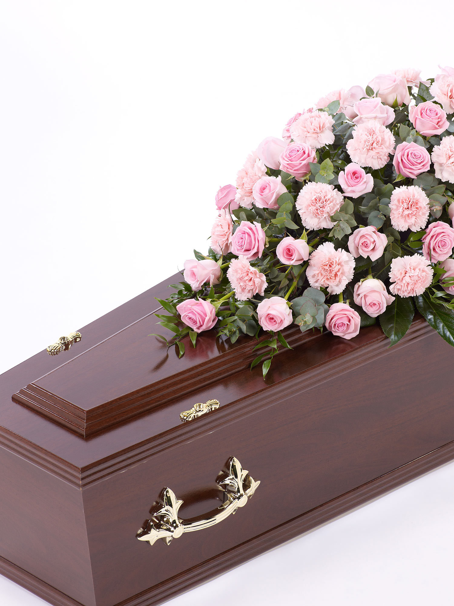 Large-headed roses combine with carnations and luxurious foliages to create this traditional casket spray.