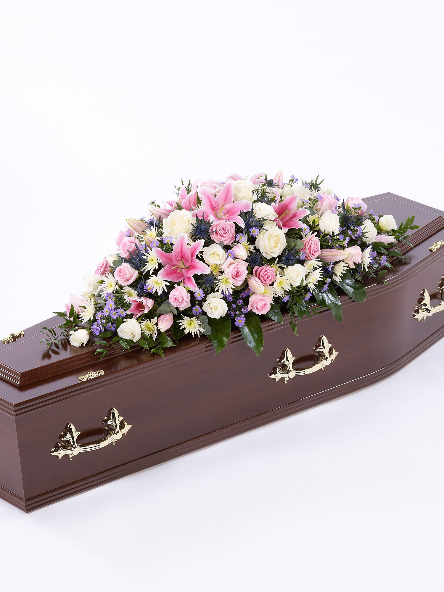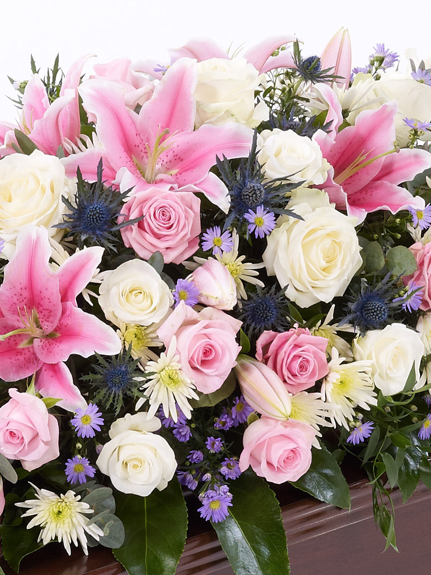 A selection of pink and white roses are arranged with stunning pink Oriental lilies, blue eryngium, white spray chrysanthemums, lilac September flowers and a selection of foliage to create this beautiful casket spray.