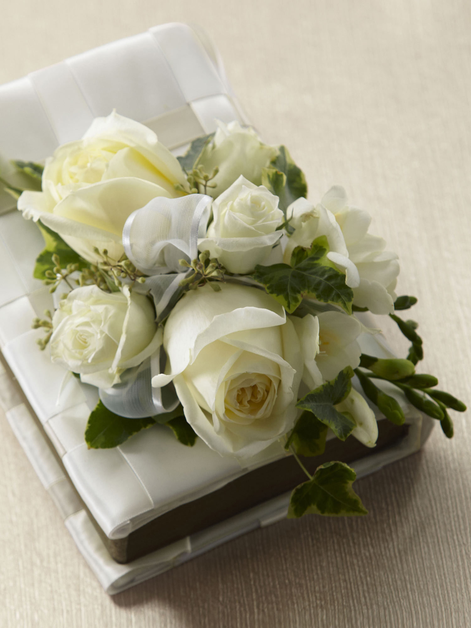 This is the perfect bridal gift on her wedding day. A petite and very beautiful bouquet of white roses, freesia, spray roses and lush greens are elegantly arranged on top of a bible accented with a basket weave pattern of white satin ribbon. A gift they will always hold dear. Approx. 11″H x 6″W.
