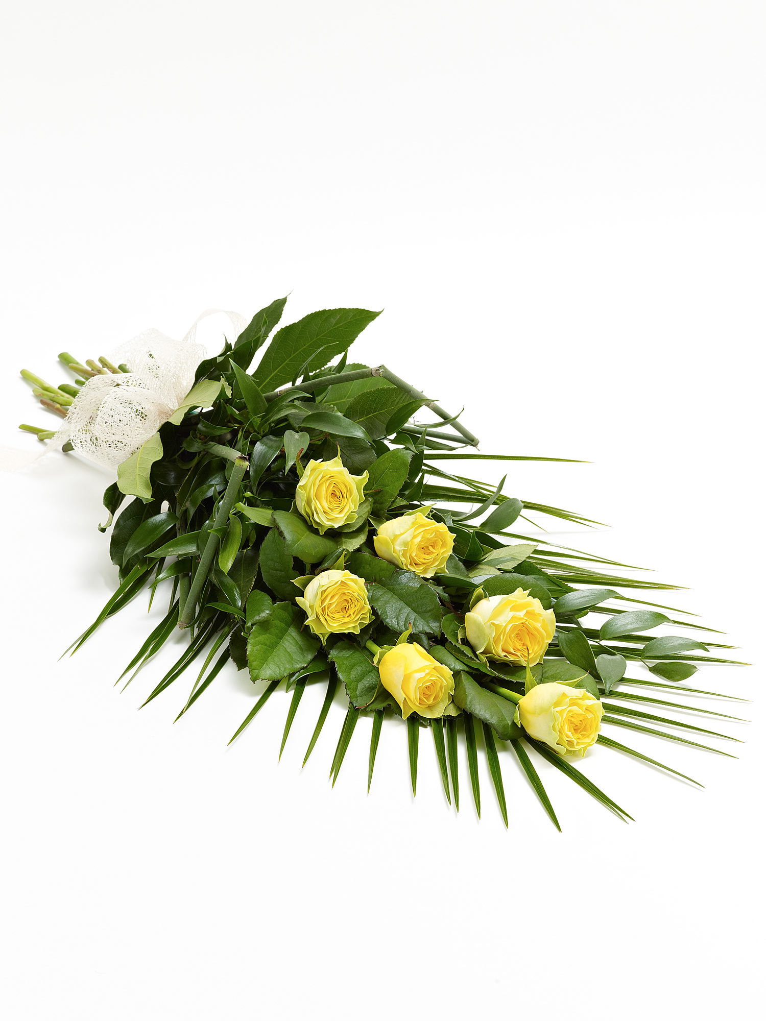 Large-headed roses are presented with aralia leaves, French ruscus and eucalyptus to create this simple, classic rose sheaf.