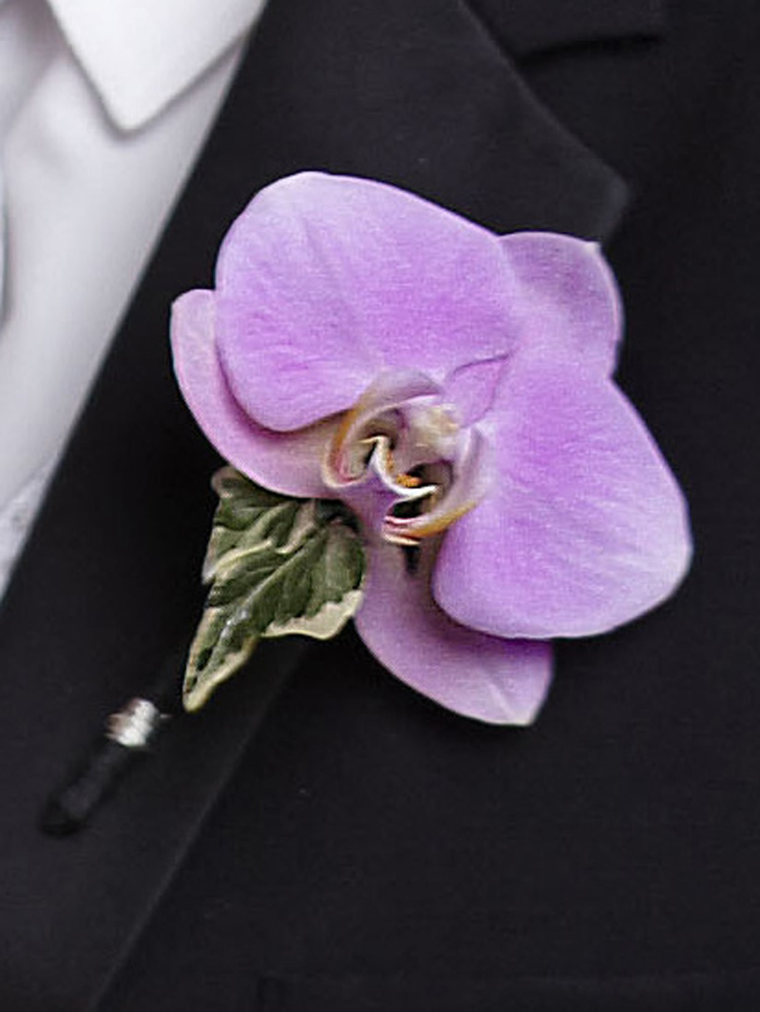 The True Love Boutonniere is a distinctive piece blooming with soft sophistication. A single lavender phalaenopsis bloom is accented with variegated ivy to create the perfect look for your groomsmen. Approx. 4″H x 3″W.