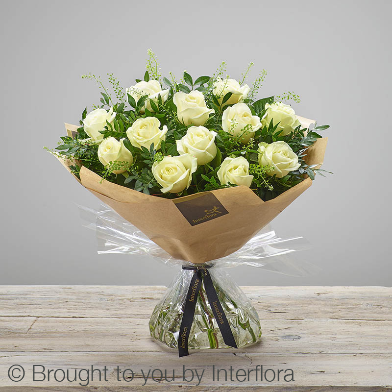 Featuring large headed white roses hand-tied with thlaspi, salal leaves and pistache, and presented in Interflora Gift Packaging.
